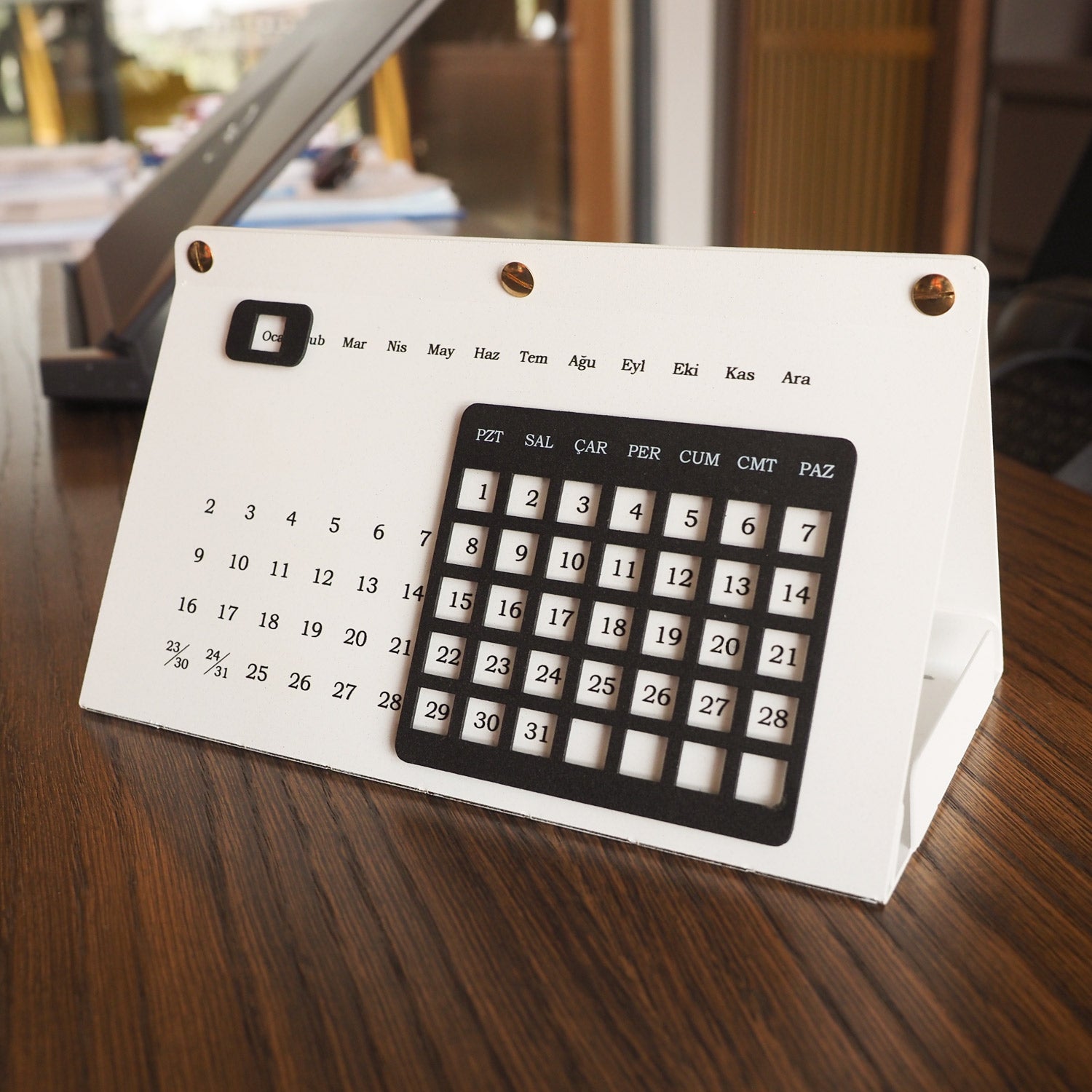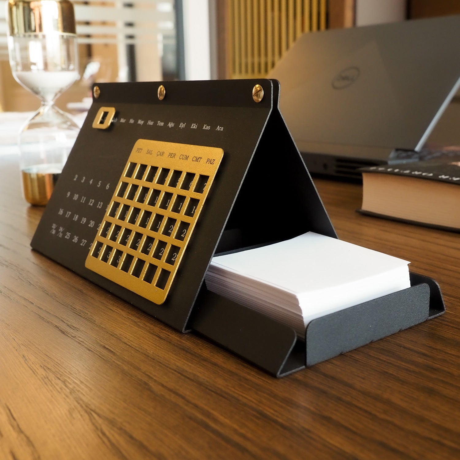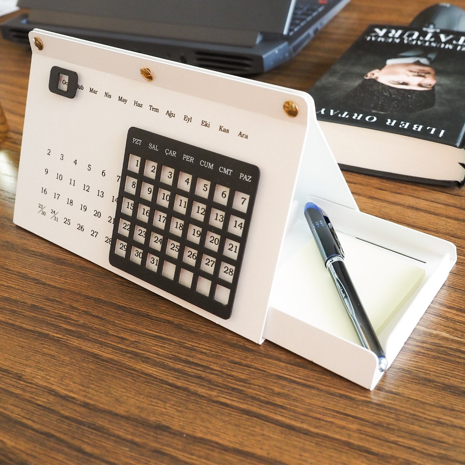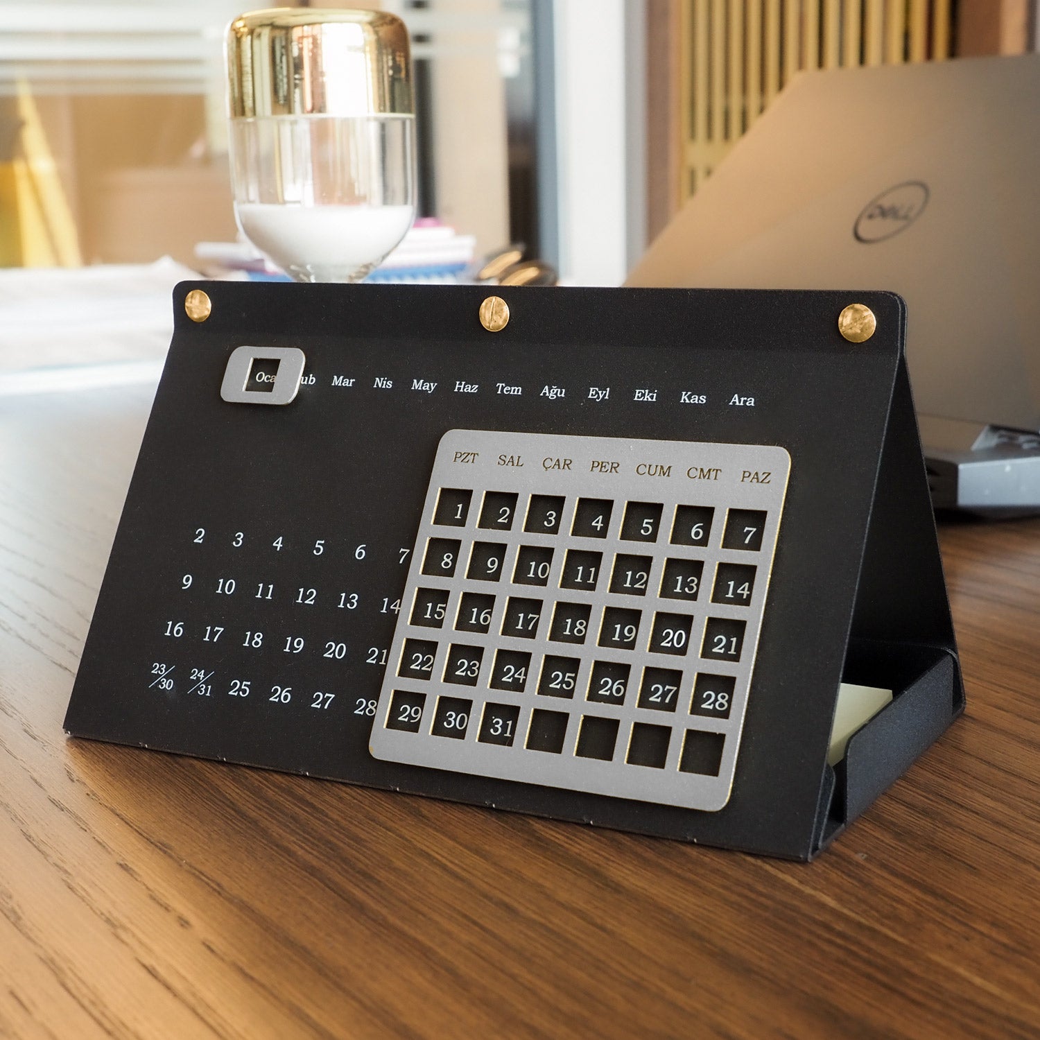 Takvimin üst kısmındaki metal parçayı hareket ettirerek günleri takip edebilir, takvimin iç kısmında bulunan organizer alanı sayesinde kartvizitlerinizi, not kağıtlarınızı, kalemlerinizi ve önemli küçük eşyalarınızı düzenli bir şekilde saklayabilirsiniz. Bu sayede masanızda hem şık hem de fonksiyonel bir düzen oluşturabilirsiniz.