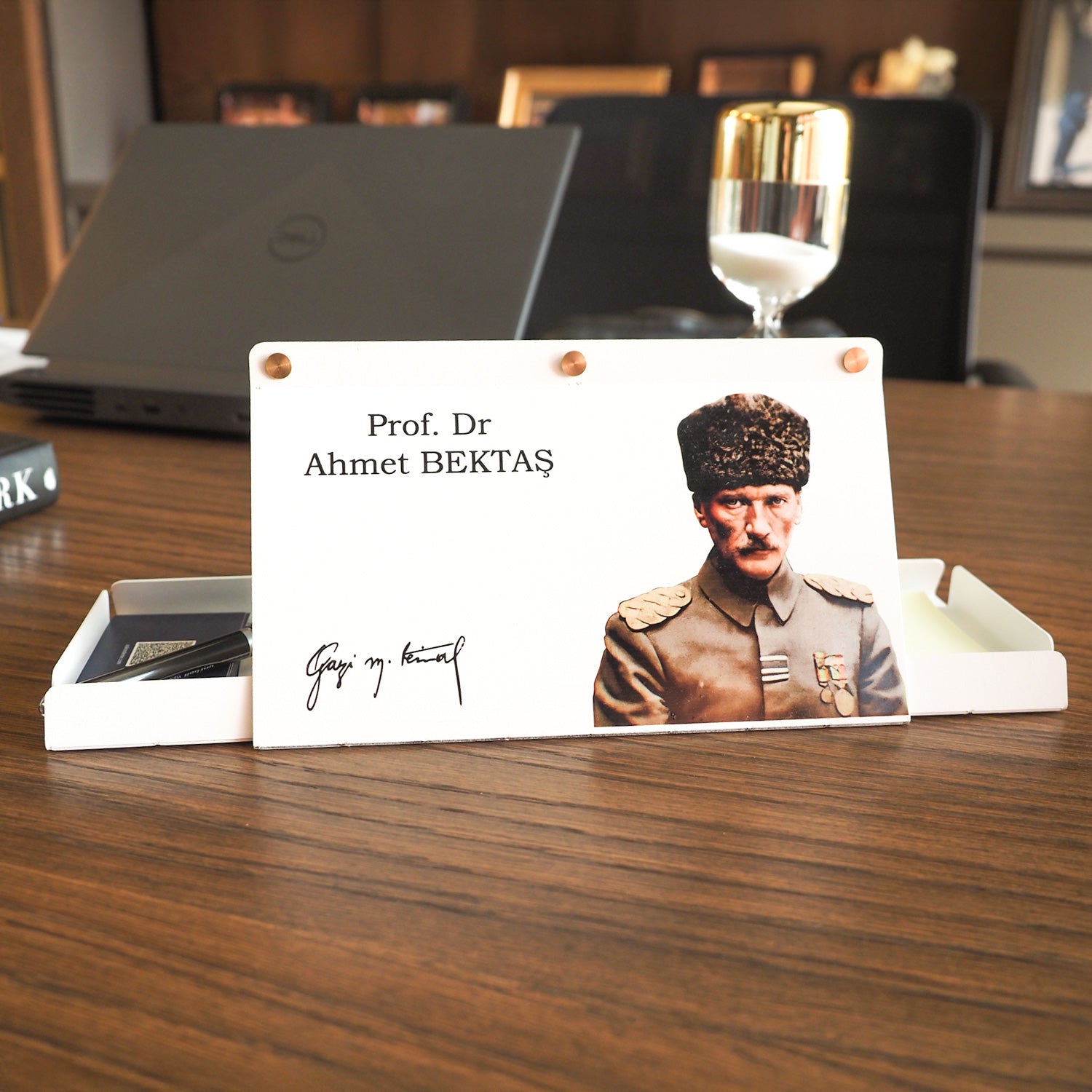 Kişiye Özel Metal Masa Takvimi ve Organizer, Atatürk’ün ilham verici duruşunu ve disiplinli yaşam tarzını çalışma alanlarınıza taşıyor. Hem tarih bilincini canlı tutan bir takvim hem de düzeni sağlayan bir organizatör olarak tasarlanan bu özel ürün, her detayında zamansız bir estetik sunuyor.